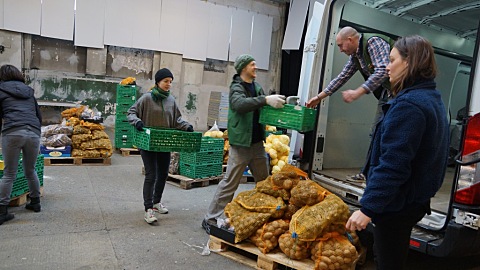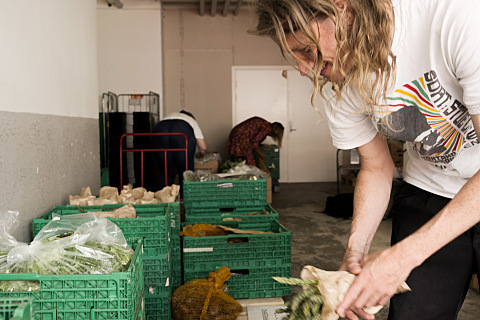 At our common storage at the Hotel- & Restaurantskolen, the food arrives, and our common coordinator Jonathan and the storage team are ready to pack vegetables, fruit, and more so they can be delivered to the local branches and then driven out to the departments by the drivers.